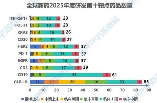 2025年,在新药研发靶点板块,由于自免领域存在热的发烫的减肥适应症,毋庸置疑GLP-1R成为最热靶点。与此同时,CD19、CD3和PD-1等靶点在临床I期和II期也展现出较为积极的研发态势,预示着免疫治疗和细胞治疗领域仍是当前的研究热点。以下是2025年度新药研发排名前十的靶点,图中仅展示药品总数,具体靶点详情内容可通过药智数据【全球药物分析系统】进行查看。
