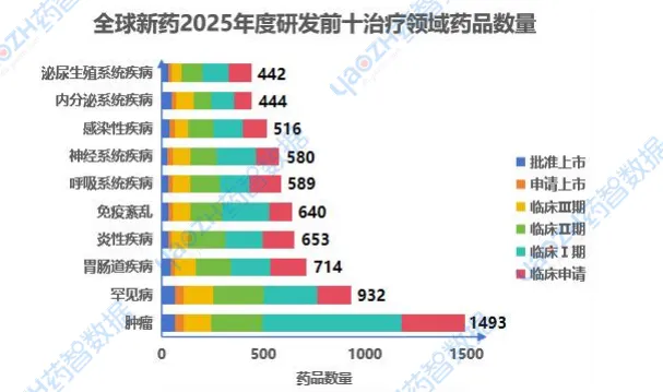 2025年,从治疗领域来说,肿瘤和罕见病领域依然是药物研发的重点,尤其在临床试验阶段。免疫相关疾病和胃肠道疾病的研发也在不断增长,反映了对精准治疗和免疫疗法的关注。尽管内分泌和泌尿生殖系统疾病的研发相对较少,整体来看,随着全球健康需求变化,药物研发正向新兴领域扩展,未来治疗前景广阔。以下是2025年度排名前十的治疗领域排名,图中仅展示药品总数,具体适应症内容可通过药智数据【全球药物分析系统】进行查看。