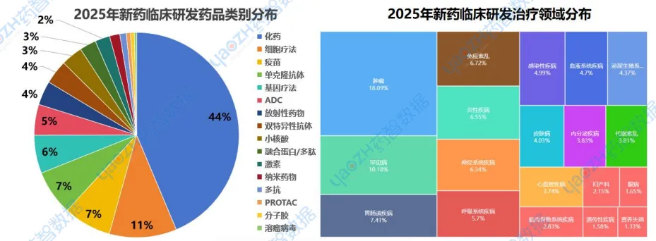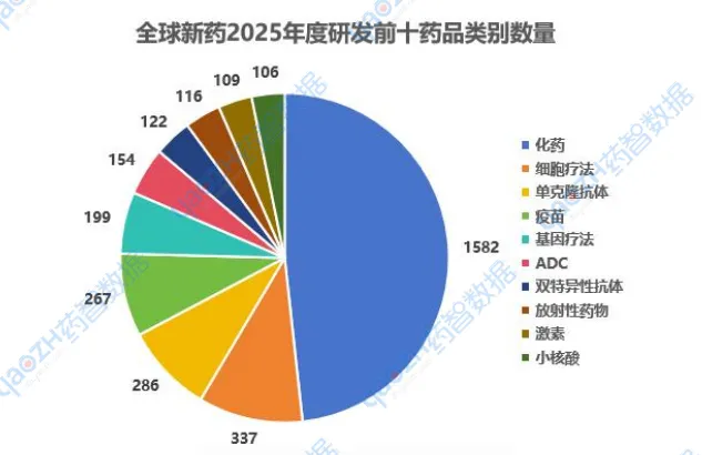 2025年,从药品类别分析,药物研发正向多元化发展,化药仍为主流,但细胞疗法、单克隆抗体和疫苗等生物治疗快速发展,尤其在抗癌和免疫治疗领域。基因疗法、ADC和核酸(今年小核酸药物研发最热)等前沿技术逐步成熟,未来治疗将更加精准和个性化,推动疾病治疗进入新阶段。 以下是2025年度新药研发排名前十的药品类别,图中仅展示药品总数,具体药品类别内容可通过药智数据【全球药物分析系统】进行查看。