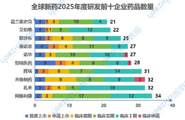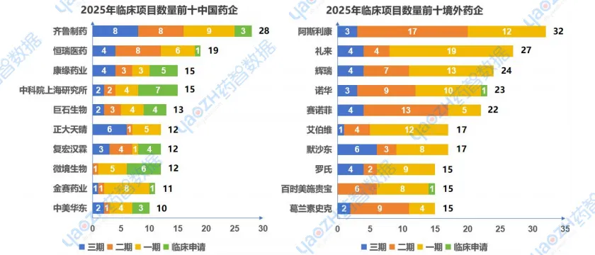 2025年,从研发企业分析,制药行业加速推进药物研发,阿斯利康和恒瑞医药等公司在临床III期表现活跃,显示出较强的研发成熟度。礼来和齐鲁制药等则专注早期研发,持续创新。随着对创新药物需求增长,未来将有更多新药问世,推动精准治疗和免疫治疗的发展。国内仅齐鲁和恒瑞挤进研发前十,剩下的都是国际大公司,中国创新药研发需加快追赶脚步。以下是2025年度前十研发企业新药研发排名,图中仅展示药品总数,具体企业研发内容可通过药智数据【全球药物分析系统】进行查看。