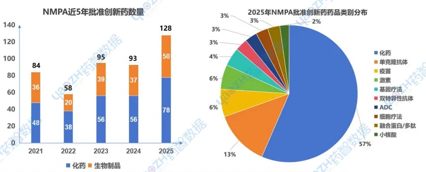 2025年,国家药品监督管理局(NMPA)累计批准了134款创新药(首次在国内上市的药品,不包括同个药物的新适应症和新剂型)。其中共有78款化药、50款生物药,6款中药,具体药品信息详见文末药品上市清单附表。在这些创新药中,化药由于其分子量小,相对研发难度小,占据半壁江山,高达57%,其次是单克隆抗体,除此之外,还包括了其他类型药物包括疫苗、激素、ADC药物、基因疗法、细胞疗法、小核酸等。