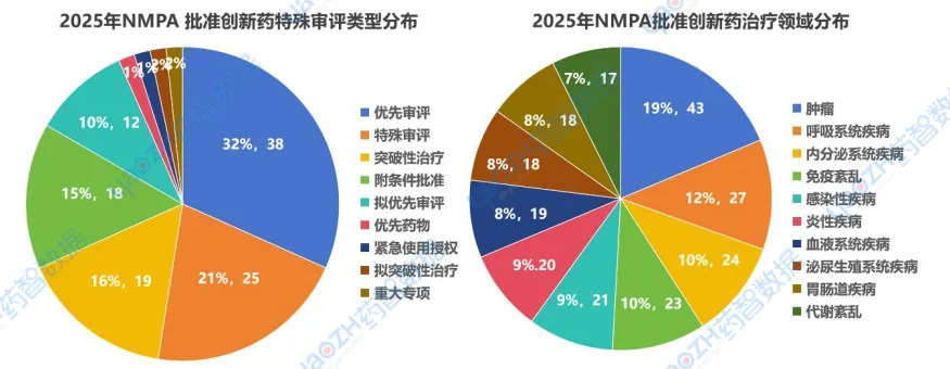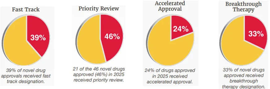 从审评流程看,除了常规特殊审评以外,2025年新增国家优先审评券(CNPV)计划,旨在将审评时间从通常的10-12个月缩短至2个月;FDA还针对随机试验不可行的情况提出了"合理机制通路"。此外,它宣布计划逐步取消动物毒性试验。在2025年,有18个药物(45%)被授予为快速通道资格、15个(33%)被认定为突破性治疗药物,21个(46%)被认定为优先审评,11个(24%)获得加速审批。