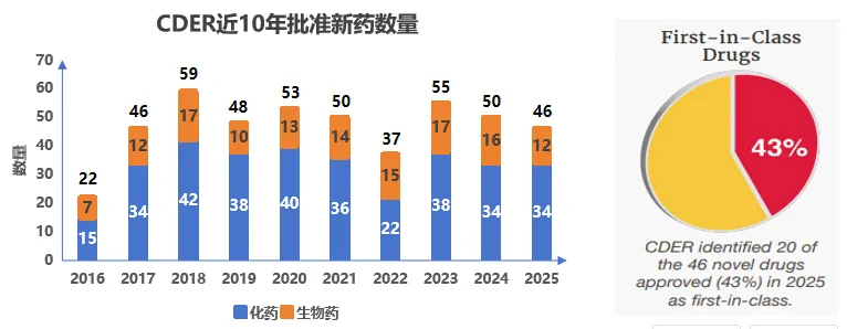 2025年,美国FDA药物评价与研究中心(CDER)共批准了46款新药,包括34个化药和12个生物药,虽较去年50款有所下降,但仍高于历史平均水平且"first-in-class"药物占比近半,共有20个药物占比43%,彰显了审批对创新质量的聚焦。2025 年,FDA经历了前所未有的内部变动。人员层面动荡显著以及政策框架同步迎来变革,但它清晰地展示了在不稳定环境中,生物医药创新并未停滞。新药开发持续从肿瘤向更广泛疾病领域拓展,基因治疗走向多元化,监管体系本身也在积极适应科学进步。