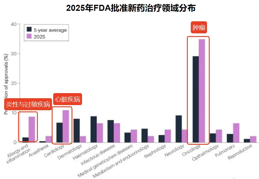 从治疗领域来看,肿瘤领域依然是最热门的赛道,全年共有16款抗肿瘤药物获批,占比高达35%,高于过去五年的平均水平。这些药物涵盖了肺癌、乳腺癌、卵巢癌、血液瘤等多种类型。心脏病学(5款,占11%)、过敏与炎症性疾病(4款,占9%)紧随其后,构成了非肿瘤领域的核心创新阵地。