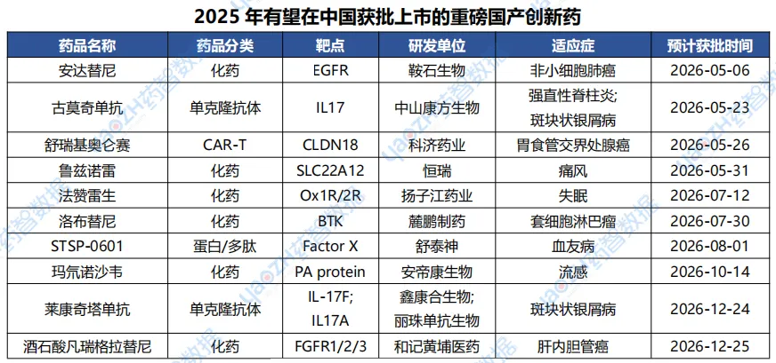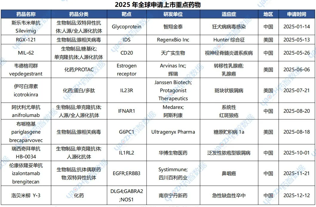 2025年FDA获批的新药中有多款为潜在重磅疗法,其中值得关注的重点药物有: