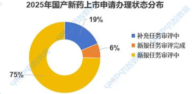 国产创新药的正逐渐加快研发的脚步走出临床,准备上市,据药智数据【药品注册与受理】数据库统计,2025年有62款国产创新药(不包括改良新、中药、生物类似药),共91个品种正处于CDE审评审批。其中,有68个品种处于新报任务审评中,占比达到3/4、6个品种已完成新报审评、17个品种处于补充任务审评中。