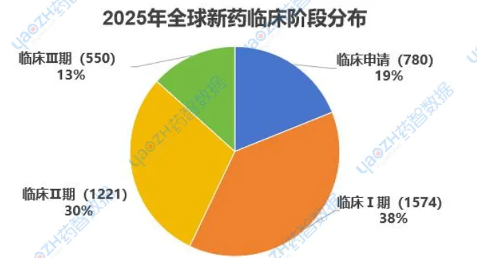 2025年有超过4000款新药在临床阶段推进到最新的阶段(首次获批进入下个新阶段),其中在境外进行的临床有2038款,在中国境内有2087款临床在研药物,临床Ⅰ期以1574款药物占比最多达到38%,临床Ⅲ期由于是临床最关键的阶段,是最终为药物注册申请的审查提供充分的依据的阶段,失败率通常较高,能进入到该阶段的药物较少,只有550款药物,只占13%。