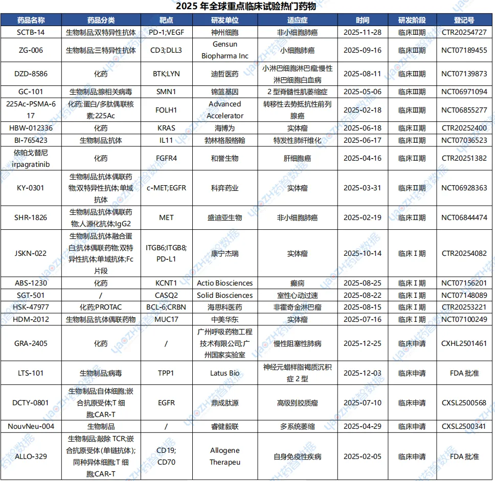 下表将展示在2025年全球进入重点临床试验的热门药物的相关信息,更多完整信息可通过药智数据【全球药物分析系统】进行查看。