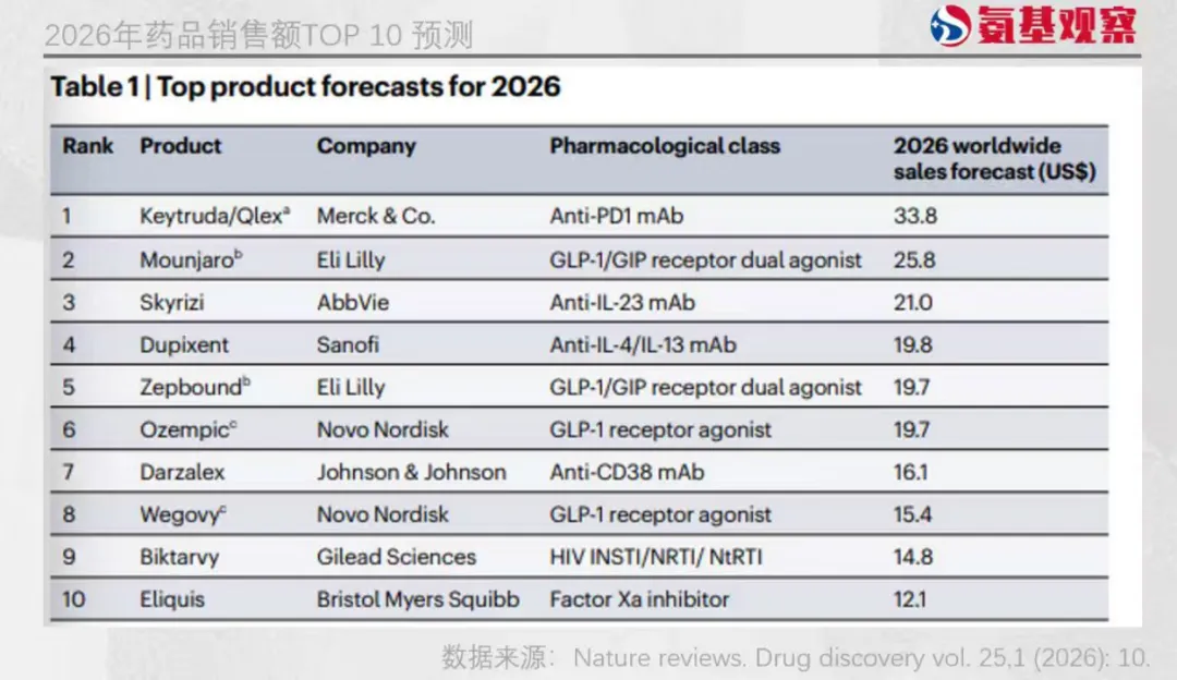 不久前,Evaluate在Nature reviews的市场分析中发布了对2026年全球药品销售额的预测分析:2026年销售额最高的10种药物中有4种是GLP-1及相关靶点药物,预计将贡献今年绝大部分的增长值。