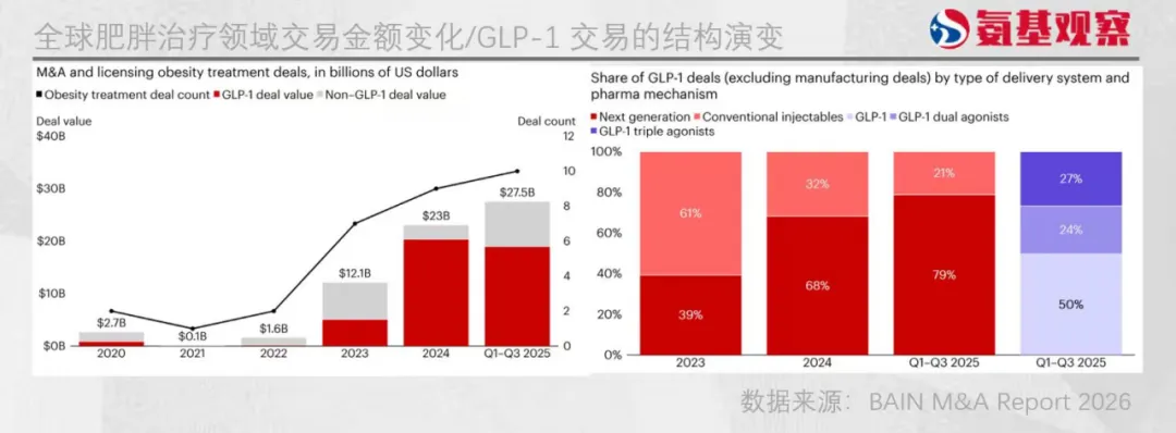 而进入2026年,减重药仍将占据并购交易价值的重要份额。但不同于第一波以“快速上市”为核心目标的新药争夺,新一轮并购更聚焦于下一代给药平台、口服制剂、小分子、新靶点以及GLP-1多激动剂分子的布局。