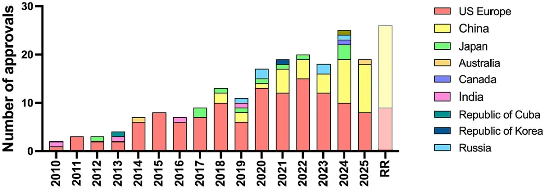 图1.2010年至2025年各个国家每年首次批准抗体治疗药物的数量