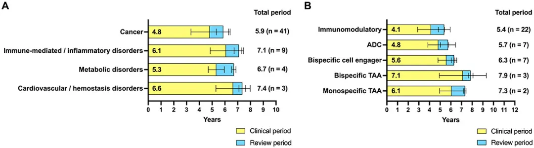 图2.按治疗领域和作用机制划分的获批抗体疗法开发周期
