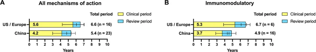 近年,中国抗体新药展现出独特的效率优势:临床开发阶段平均4.2年,虽监管审查阶段(1.2年)略长于欧美(1 年),但总开发周期(5.4年)较欧美新药(6.6年)短1.2年。如果单看免疫调节类抗体这一细分领域,中国产品临床周期(3.7年)比欧美(5.3年)短1.6年,且这一优势并非源于监管标准差异,而是临床方案优化、患者招募效率提升等多重因素的综合体现。