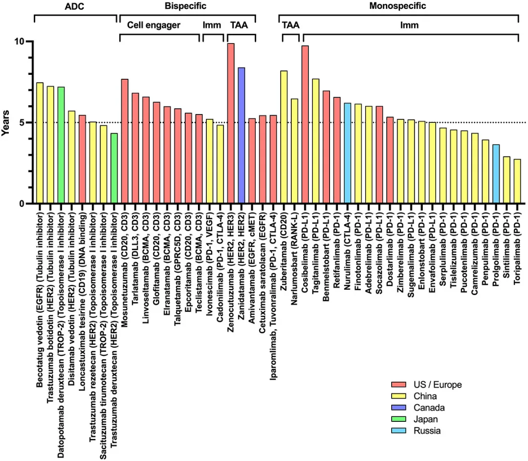 图3.国家/地区获批抗癌抗体疗法开发周期