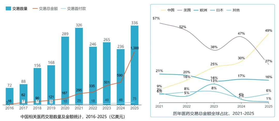 2025年,中国药企达成的对外授权(BD)交易总额高达1356.55亿美元,占据全球总份额的49%。交易模式也已从早期的单一产品授权,升级为与跨国巨头共担风险、共享全球收益的战略联盟。