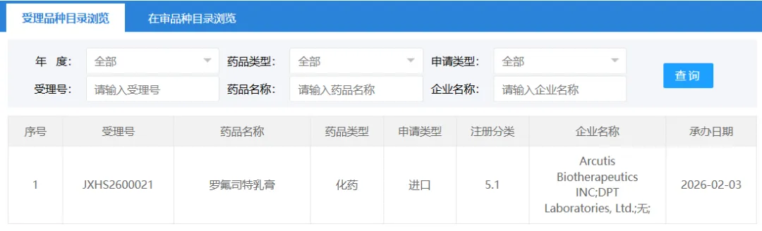 2 月 3 日,CDE 官网显示,华东医药从 Arcutis Biotherapeutics 引进的罗氟司特乳膏新适应症上市申请获受理。根据该药的临床研究进度,Insight 数据库推测本次申报的新适应症可能为用于治疗 2-5 岁特应性皮炎患者。