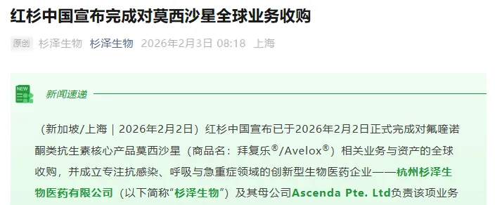 2月2日,红杉中国宣布正式完成对氟喹诺酮类抗生素核心产品莫西沙星(商品名:拜复乐®/Avelox®)相关业务与资产的全球收购,并成立专注抗感染与呼吸领域的创新型生物医药企业——杭州杉泽生物医药有限公司(以下简称“杉泽生物”)及其母公司Ascenda Pte. Ltd.负责该项业务的运营。