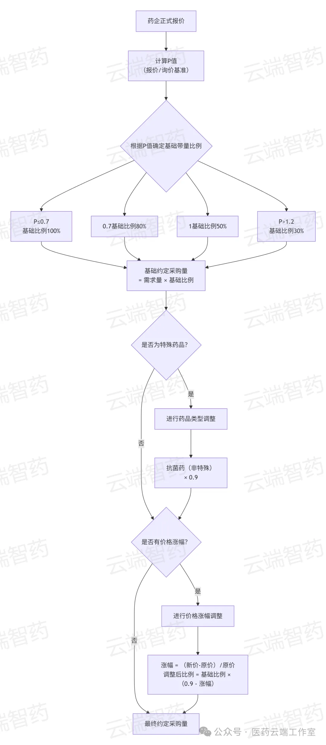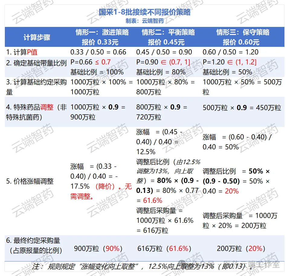 对于原中选企业,哪怕报价仍低于询价基准,但只要高于自身原价,就会触发采购量削减。如情形二,尽管P值(0.90)能获得80%的基础量,但因12.5%的涨幅,最终采购量被削减至61.6%。