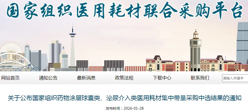 按照《国家组织药物涂层球囊类、泌尿介入类医用耗材集中带量采购文件(GH-HD2025-1)》规定,国家组织高值医用耗材联合采购办公室开展了药物涂层球囊类、泌尿介入类医用耗材集中带量采购工作,现公布中选结果(详见附件)。请联盟各地区于2026年5月执行药物涂层球囊类、泌尿介入类医用耗材集中带量采购中选结果。具体执行日期由联盟各地区确定。