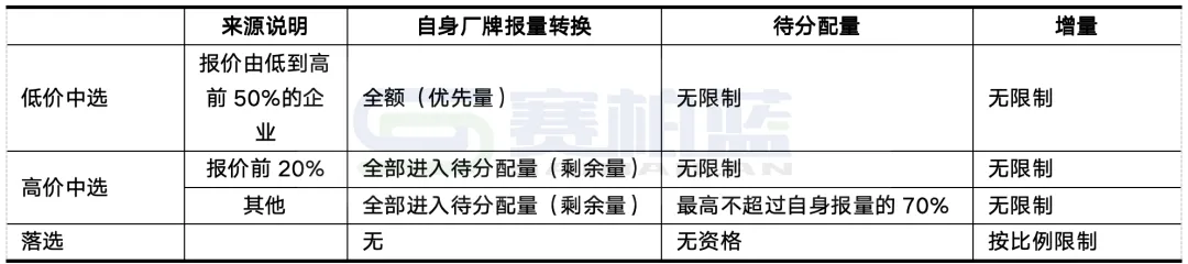 此外,本次标书对于待分配量的界定与既往有所差异,对于选择询价基准0.7倍以上的企业来说,其报量进入待分配量的比例等于80%减去自身最高的报量比例,余下的20%则进入自由市场。
