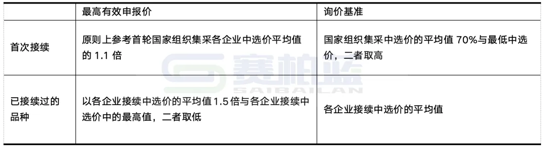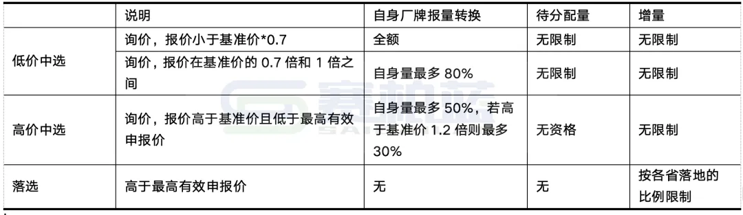 标书对于原中选企业和未曾中选企业在基础量的比例上也做了一些限制,原中选企业只需不涨价,便可按照上表拿到基础报量比例,而对于非中选企业而言,只要报价高于询价标准的7折,就需要按照涨幅来降低基础报量比例。