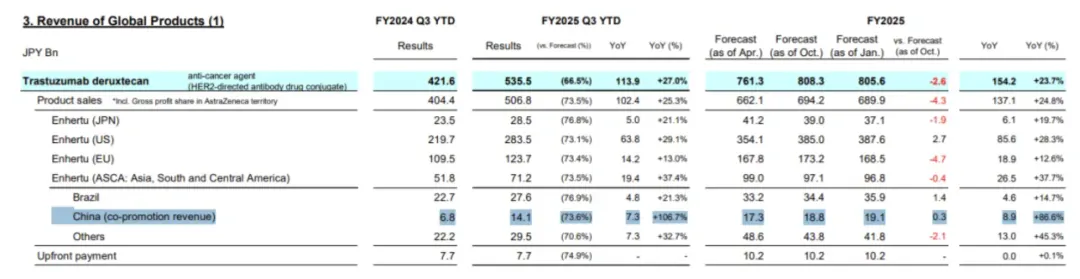乍一看中国区是Enhertu增速最快的,但实际上中国区的销售收入只占总收入的2.8%不到(以2025财年前三季度的口径)。