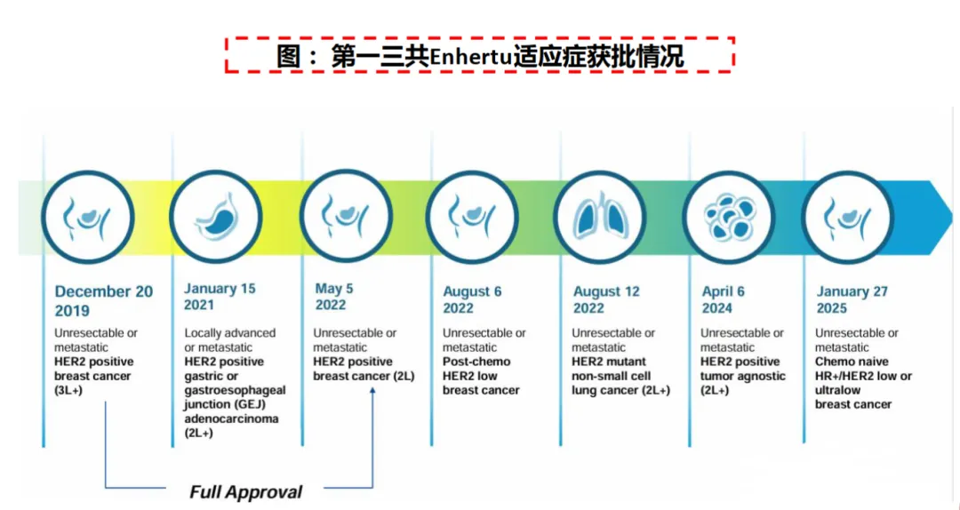 凭借着2019-2022年在乳腺癌适应症的适应症覆盖,Enhertu商业化销售在后续年份加速;2024年-2025年,Enhertu又分别获批了二线及以上HER2阳性实体瘤(泛瘤种)、二线HR+/HER2低或超低表达乳腺癌。