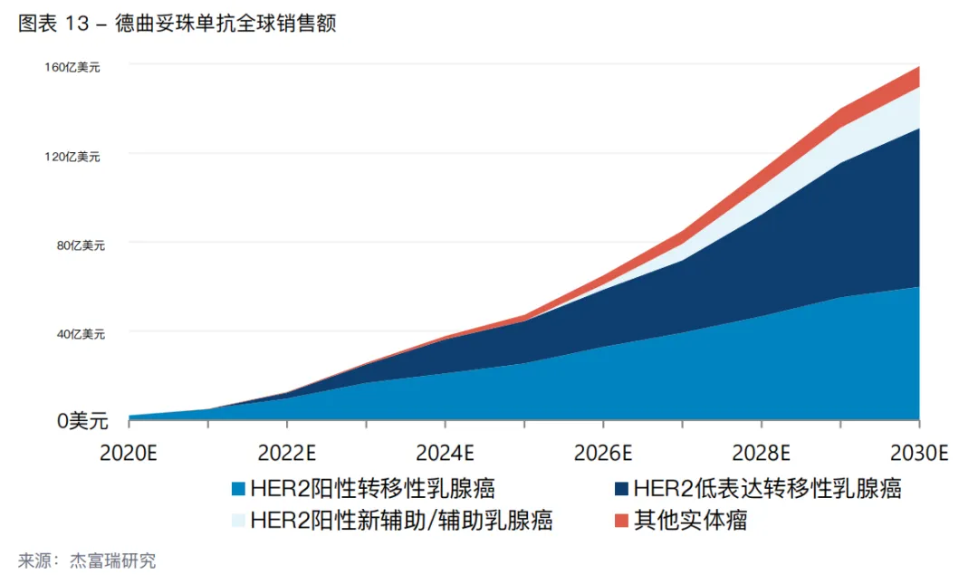 阿斯利康预计Enhertu在2030年有望接近160亿美元的销售峰值,其中有超过120亿美元的销售可能由HER2阳性乳腺癌、HER2低表达乳腺癌两大适应症贡献。