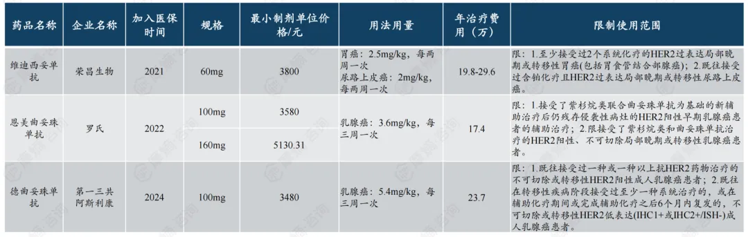 除了恒瑞的瑞康曲妥珠单抗外,其他三款药物均进入了国家医保目录,以2024年摩熵咨询统计数据,Enhertu的年治疗费用为23.7万,略高于恩美曲妥珠单抗的17.4万元。