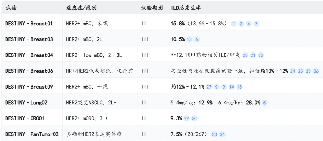 可以看到,在HER2阳性的Breast03、04、06、09的不同乳腺癌分型三期临床中,ILD的总发生率分别为10.5%、12.1%、约10-12%和12%。