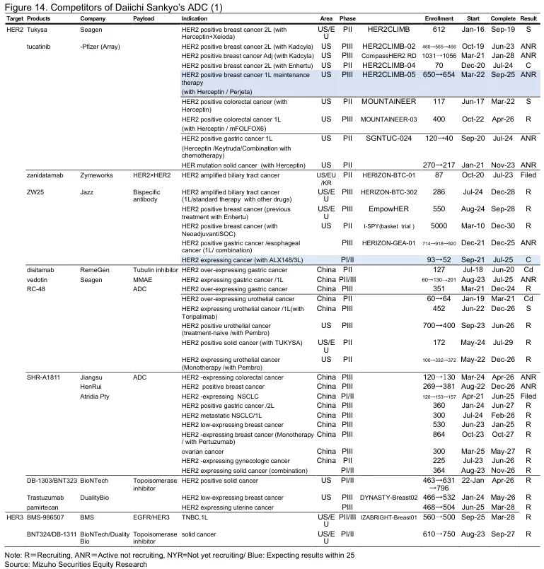 有人提出,Enhertu是否会出现当年修美乐在国内市场水土不服的情况?目前很难判断,Enhertu的最大差异化优势市场其实在于HER2低表达乳腺癌市场以及后续可能的一线HER2阳性乳腺癌市场,如果有国产ADC在此适应症能够与Enhertu分庭抗礼,那么有可能压缩Enhertu的市场份额。