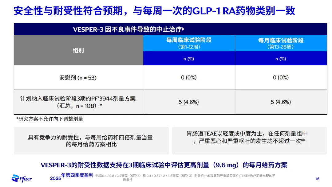 2月3日晚,辉瑞举行了2025Q4电话会,同时公布了PF-3944的每月一次注射治疗、为期64周的VESPER-3研究结果(2b期)。