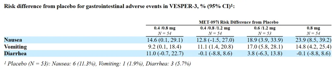 胃肠道不良反应看似能打,算下来VESPER-3研究第1和第3剂量组的合并停药率接近10%,这一停药率数据对比同类药物就落在下风。