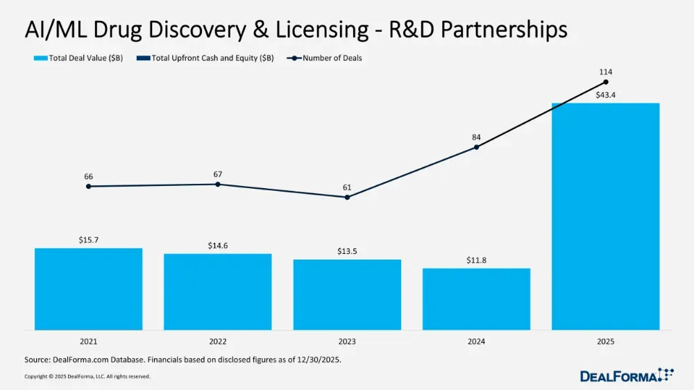 实际上,2024年至今,全球营收额TOP10的制药企业,每一家都有AI/机器学习相关交易达成。据Deal Forma统计,2024年全球医药领域共有84起AI/机器学习相关的合作与交易,总金额118亿美元;2025年攀升至114起,总金额434亿美元,金额同比增长270%。