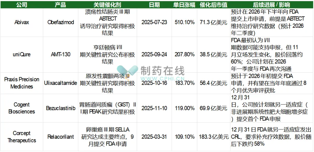 表1. 2025年股价单日涨幅最高的中型生物制药公司