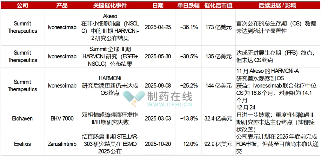 2025 年的中型生物科技公司的命运与他们的II,III期资产读数息息相关。一系列关键数据在公布后的单个交易日内引发了极端的正负股价反应,使部分公司迅速完成估值层级跃迁,也让另一些公司市值在短时间内经历了强烈跳水(表1-2)。“一顾倾人城,再顾倾人国”的股价飙升,或是“纵使相逢应不识,尘满面,鬓如霜”的暴涨后暴跌,这两场场面交替上演在2025年的医药领域。这种一念天堂,一念地狱的情况在2025年经常发生在II,III期读数之后。然而II,III期临床读数成功之后,究竟带来的是“烟花易冷”的片刻欢愉,还是“即授永昌”的改天换命?
