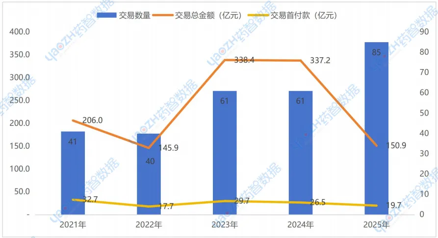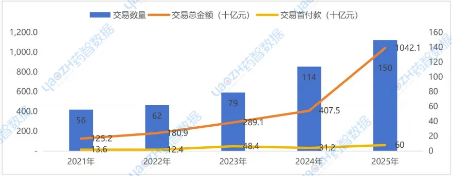 根据药智数据不完全统计,2025年全球范围内医药交易数量和交易金额大幅增加,其中药品交易数量达1357笔(同比增加37%),远超前两年增长水平;总交易金额增至3.4万亿元(同比增加152.7%),交易首付款为2151亿元(同比增加44.4%),均突破历史记录。