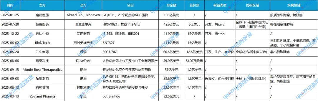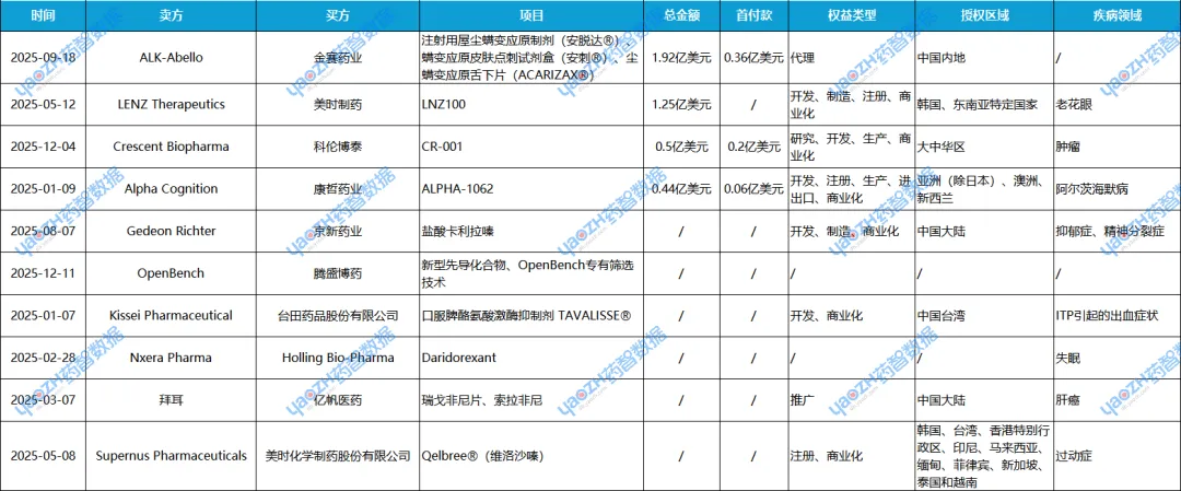 根据药智数据不完全统计,2025年license in交易项目整体数量持续缩减之外,其中较多项目交易并未公开披露其交易金额相关信息,根据公开披露数据,license in交易总金额最大的是ALK-Abello与金赛药业的合作,根据协议,金赛药业将支付总金额约1.92亿美元以及首付款约0.36亿美元,用于获得3款产品在中国大陆地区的商业化权益。