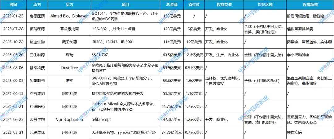 根据药智数据不完全统计,2025年全球医药交易总金额最大的是启德医药与Biohaven和AimedBio的合作,合作内容包括同类首创FGFR3 ADC药物GQ1011的全球开发与商业化独家授权Biohaven,以及创新生物偶联核心平台技术授权许可给两个公司,赋能美国与韩国合作伙伴共计21个靶点的ADC药物创新,总交易金额超过 130 亿美元。2025年全球医药交易前10名的重磅交易,中国企业就占了七席。