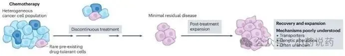 当患者接受化疗时,化疗通常以周期性给药以促进患者康复,不连续的治疗可能会导致罕见的预先存在的耐药细胞的选择和存活,这些细胞会作为最小的残留疾病持续存在。随着时间的推移,这些幸存的克隆经历了恢复和随后的扩张。在这里,获得性耐药性的机制可能包括遗传改变、蛋白质外排变化或其他未知因素。
