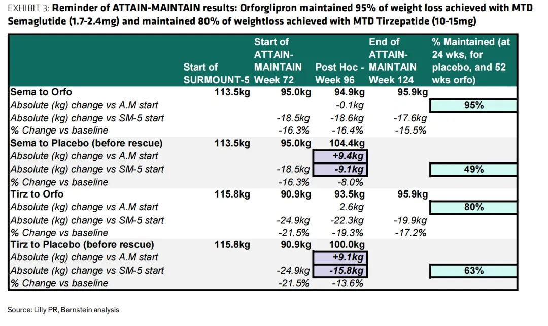 另外值得注意的是,ATTAIN-MAINTAIN试验结果回顾:使用最大耐受剂量(MTD)的司美格鲁肽和替尔泊肽分别达成一定减重效果后,换用Orforglipron可分别维持其95%和80%的减重效果,Orforglipron在减重维持期的市场同样不可小觑。