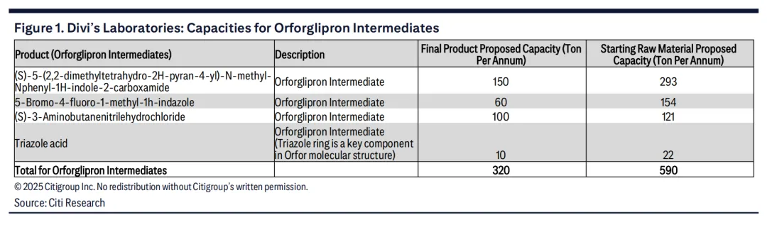 印度的迪维实验室(Divi's Laboratories)为Orforglipron新建了超300吨的中间体产能,以及近600吨的产品起始物料产能。花旗预计,迪维实验室将有望从这300吨的中间体产能中获取超5亿美金的年收入,预计占据整体产业链至少25%的价值量。