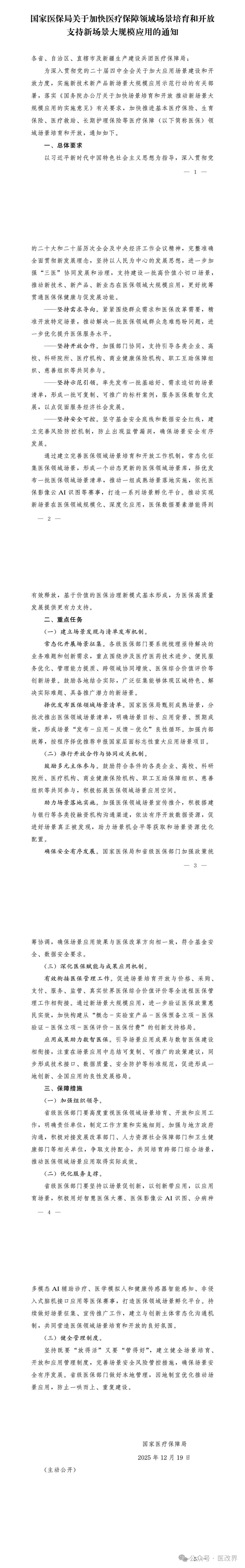 国家医疗保障局深入贯彻党的二十届四中全会关于加大应用场景建设和开放力度的有关部署,落实《国务院办公厅关于加快场景培育和开放推动新场景大规模应用的实施意见》具体要求,已于近期印发《关于加快医疗保障领域场景培育和开放支持新场景大规模应用的通知》(以下简称通知),解读如下。