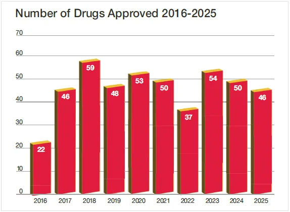 近日,美国食品药品监督管理局(FDA)药物评价与研究中心(CDER)发布《通过创新推进健康:2025年度新药审评报告》(Advancing Health Through Innovation: New Drug Therapy Approvals 2025)。该报告系统总结了2025年新药的审批情况。全年,CDER共批准了46款新药;若将生物制品评估与研究中心(CBER)的数据也计算在内,2025年美国共批准了58种新药。CDER批准的新药数量与近五年的平均水平基本持平。