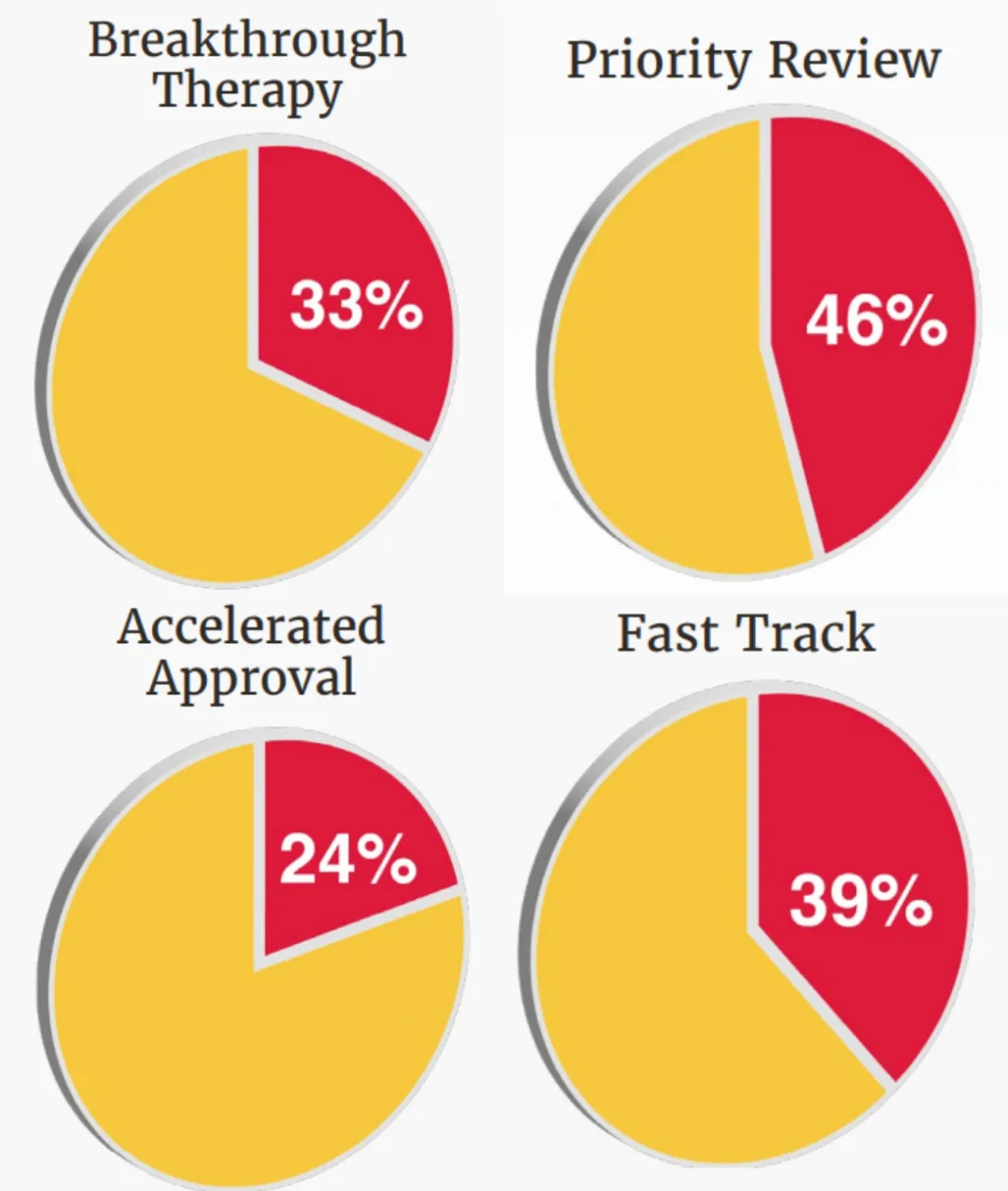 FDA在2025年进一步加大了加速审评力度。数据显示,在获批的所有新药中,有18款(39%)获得快速通道资格;15款(33%)曾获得突破性疗法认定,21款(46%)获得优先审评资格,11款(24%)通过加速批准途径获批。