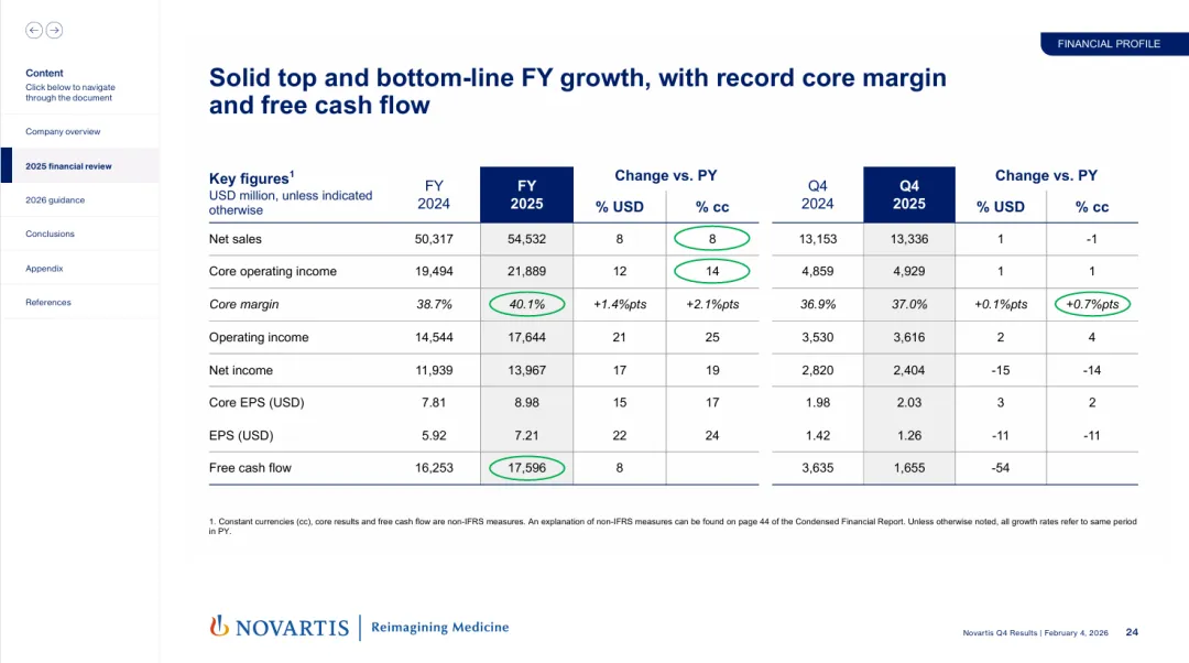 2026年2月4日,诺华公布2025年全年财务业绩,展现出持续增长势头。公司全年净销售额达545.32亿美元,同比增长8%(按固定汇率计算)。其核心营业利润率首次达到40.1%,实现自2018年以来的持续增长。