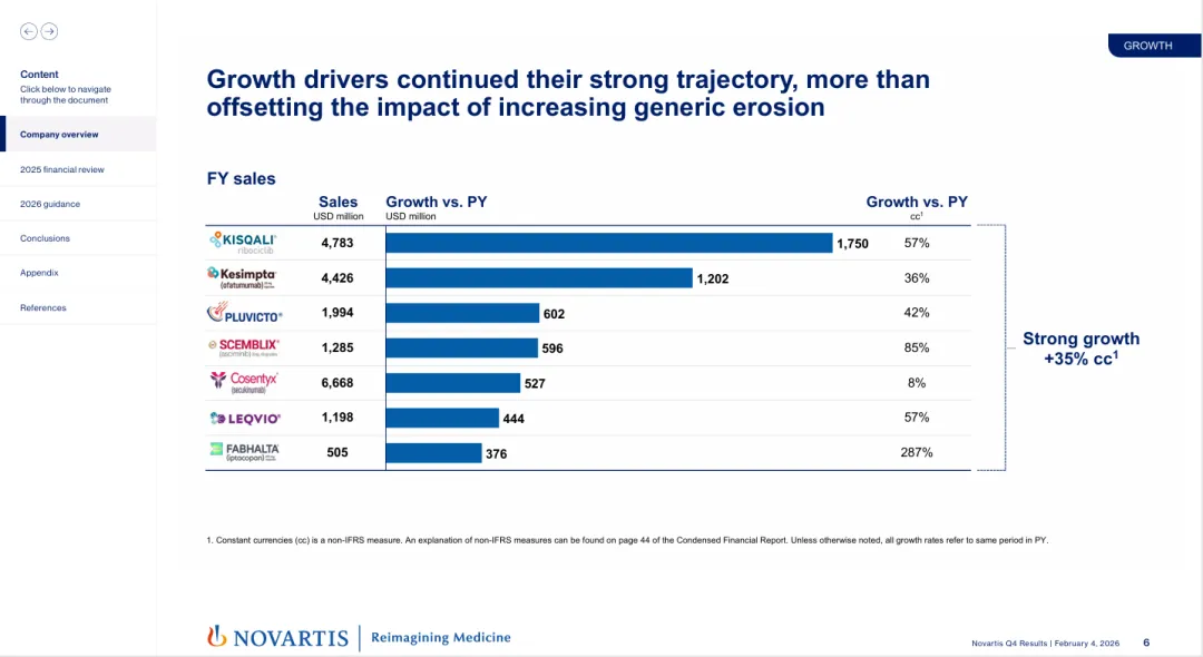 CDK4/6抑制剂Kisqali表现尤为突出。2025年全年销售额达到48亿美元,同比增长57%,远超市场增速和同类竞争产品。