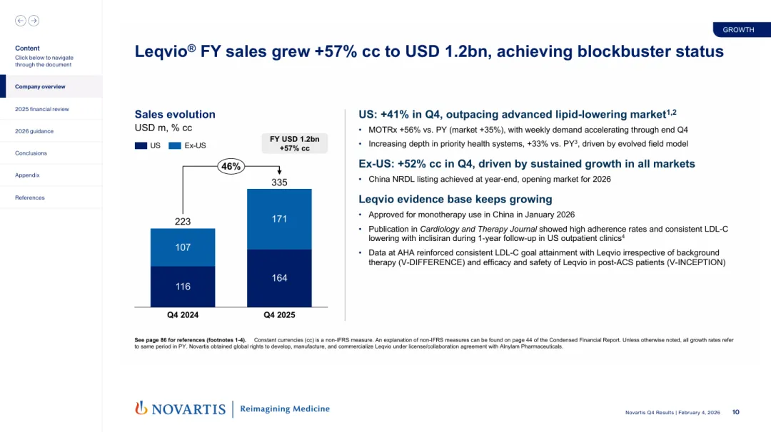 全球首款用于降低低密度脂蛋白胆固醇的小干扰RNA药物Leqvio在2025年成功晋级“重磅炸弹”行列。全年销售额达12亿美元,同比增长57%。该产品在美国和中国市场均取得重要进展,尤其是在中国成功纳入国家医保目录,为2026年市场扩张奠定基础。