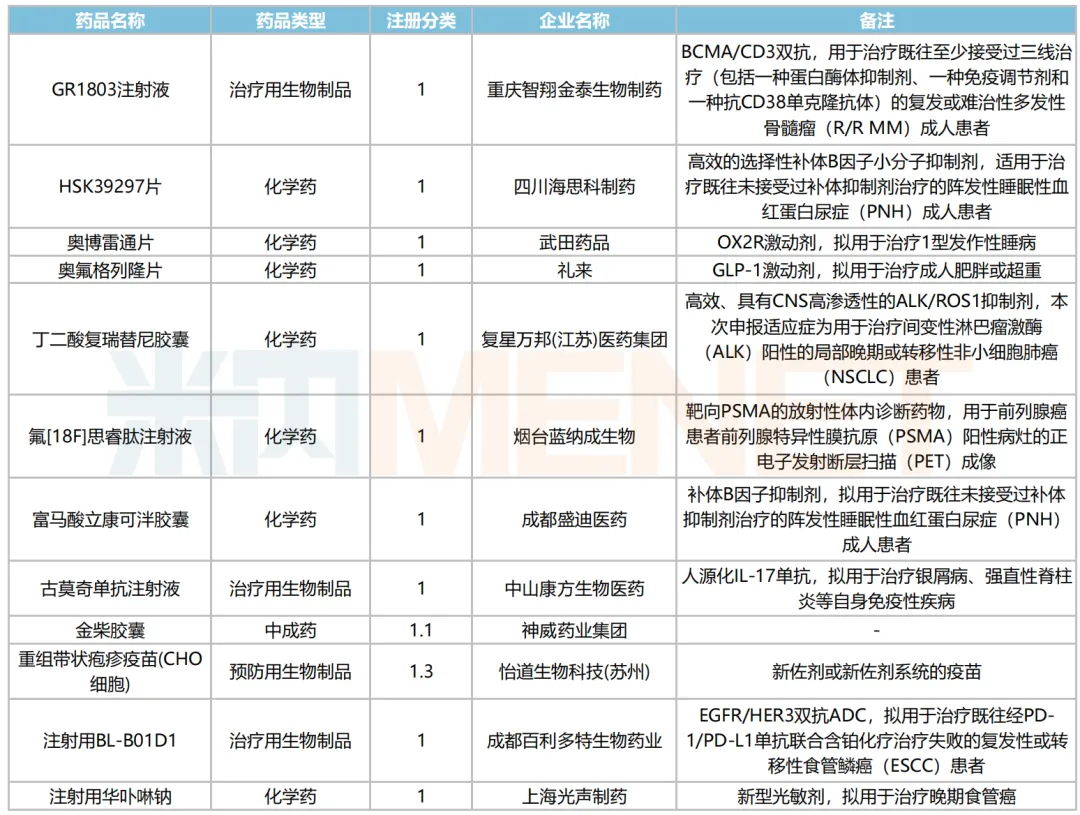 数据来源:米内网中国申报进度数据库(MED)、CDE、NMPA;相关统计字段按药品名称统计,申报企业数按主申报企业统计,时间截至2026年1月31日;获批品种按NMPA批件发布时间统计;药物作用靶点以及适应症整理自公开资料;首仿品种指中国内地首仿品种。