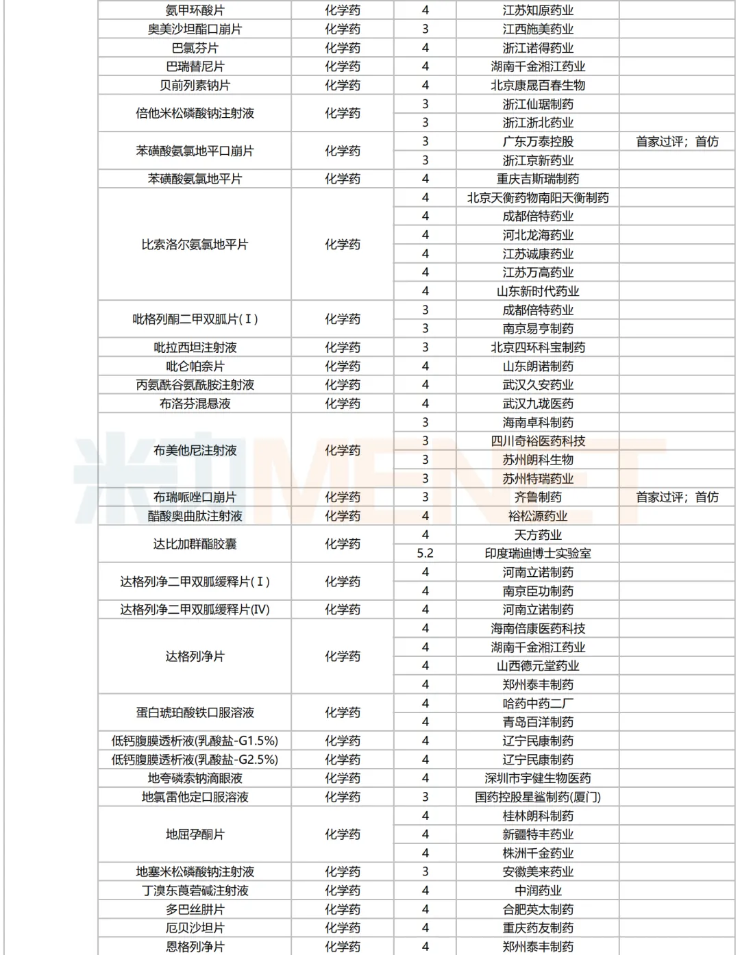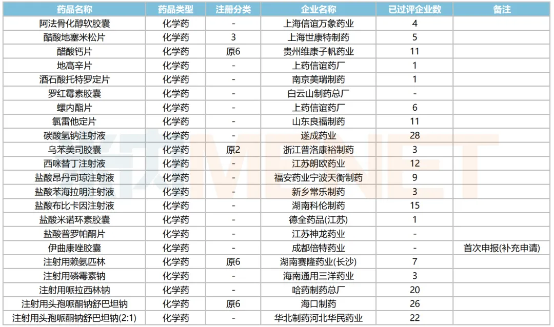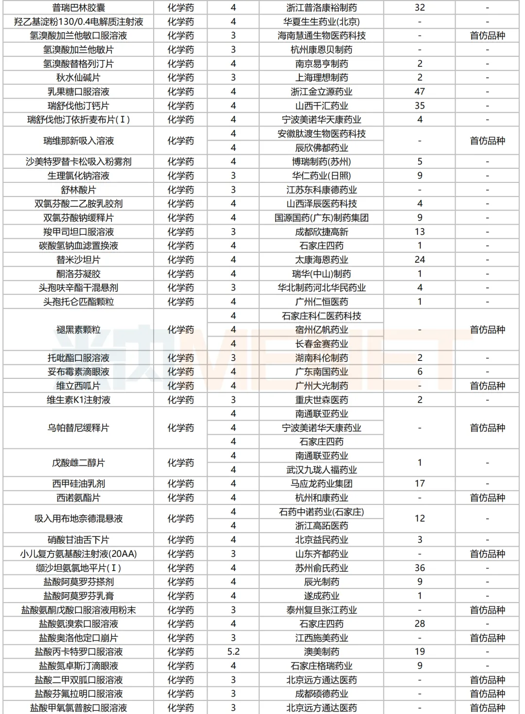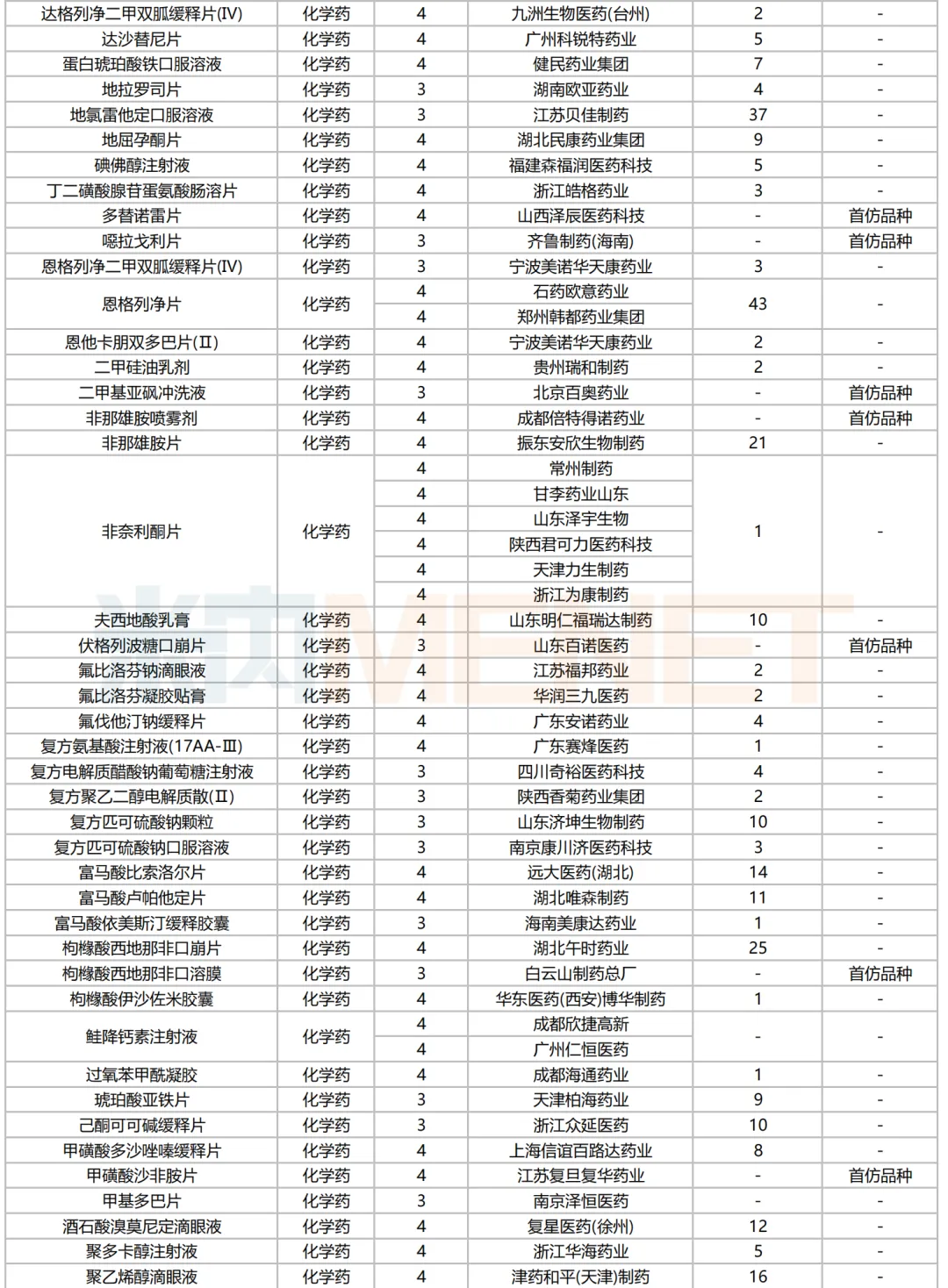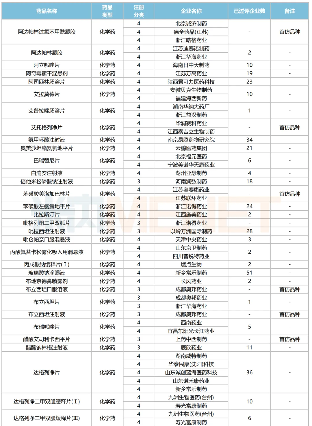 212个品种按新分类仿制申请获批并视同过评,29个品种按存量品种一致性评价补充申请过评。其中12个品种为首家过评。阿齐沙坦氨氯地平片(上海汇伦医药)、苯磺酸氨氯地平口崩片(广东万泰控股)、布瑞哌唑口崩片(齐鲁制药)、头孢托仑匹酯片(福安药业庆余堂制药)、妥洛特罗贴剂(北京泰德制药)、溴吡斯的明口服溶液(上药中西制药)、盐酸溴己新吸入溶液(合肥国药诺和药业)、依伏卡塞片(杭州仟源保灵药业、江西科睿药业)、注射用磷酸左奥硝唑酯二钠(华创合成制药)等9个品种为首仿品种。